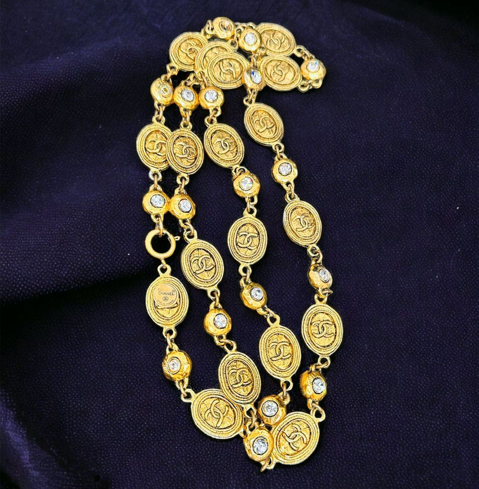 CHANEL Early 1980’s gold plated Vintage CC Mark coin and crystal long Necklace